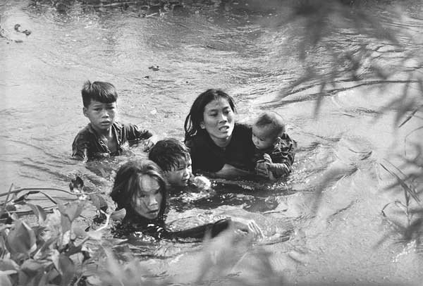 bà mẹ dẫn đàn con lội sông tránh bom Mỹ... là những hình ảnh về Việt Nam gây