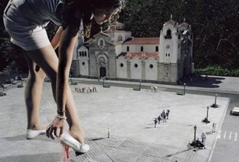 Bức ảnh được chụp bởi nhiếp ảnh gia Julia Fullerton-Batten với tựa đề “Những câu chuyện về giới trẻ”. Trên thực tế, người mẫu nữ đứng trên mô hình của 1 ngôi làng thu nhỏ.