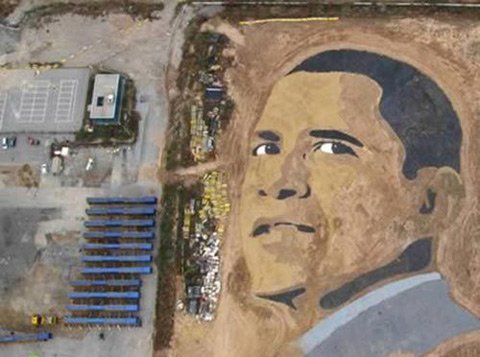 Bức chân dung khuôn mặt Tổng thống Mỹ Barack Obama, được hoàn thành bởi những sỏi, đất, cát ở Barcelona, rộng gần 1 ha, tại bãi biển nơi đây.
