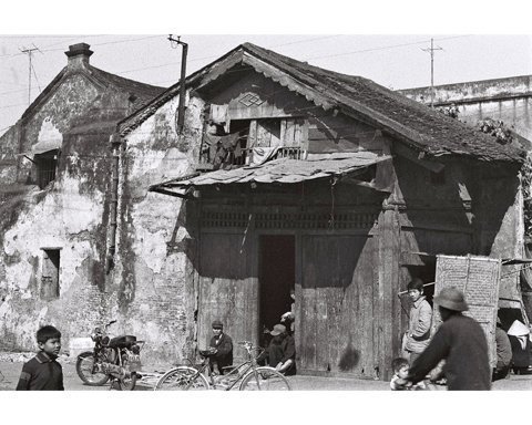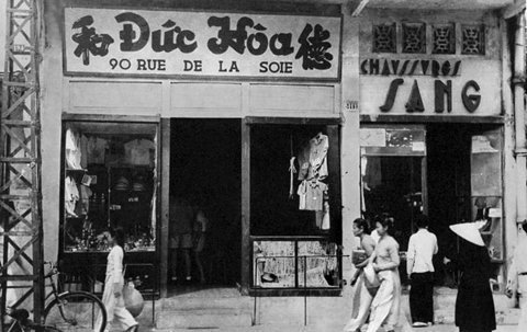Cửa hiệu Đức Hòa 90 phố Hàng Đào. Trong ảnh có thể thấy phụ nữ Hà Nội ra phố mặc áo dài. Trước cửa hiệu có hàng rào sắt để dựng xe đạp và ngăn việc dựng xe vào cửa kính.