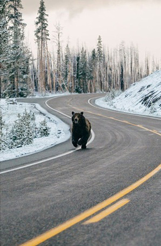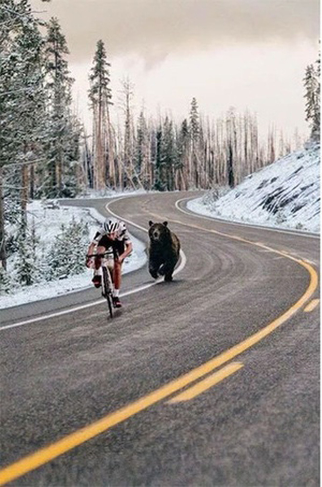 Dường như con gấu là một chút động lực cho vận động viên này nhanh tiến về đích. Tuy vậy, hình ảnh này hoàn toàn là giả, là sản phẩm của photoshop. Trong bức ảnh chỉ có mỗi con gấu trên đường, và nhiều người tin rằng hình ảnh này được chụp ở công viên quốc gia Yellowstone (Mỹ).