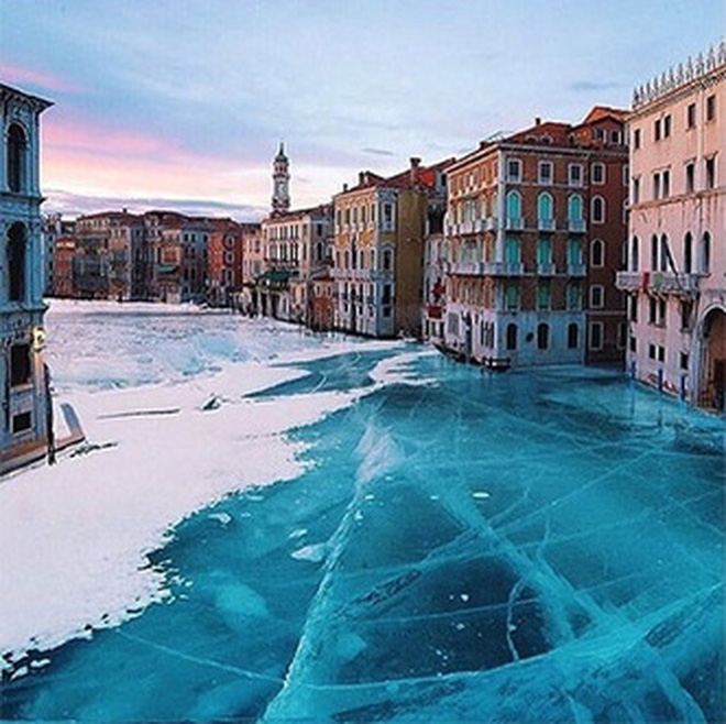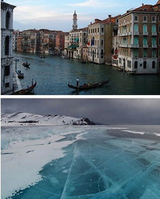 Thành phố Venice với những con kênh thơ mộng nếu bị đóng băng thì trông sẽ cực kỳ ấn tượng đúng không? Đúng là như thế nhưng sẽ chẳng có băng tuyết nào cả, bức ảnh trên chỉ được ghép bởi băng tuyết trên hồ Baikal của Nga mà thôi.