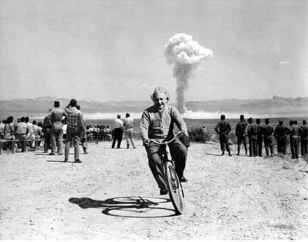 5. Hình ảnh nhà bác học thiên tài Albert Einstein đạp xe để chạy tránh càng xa vụ nổ bom càng tốt