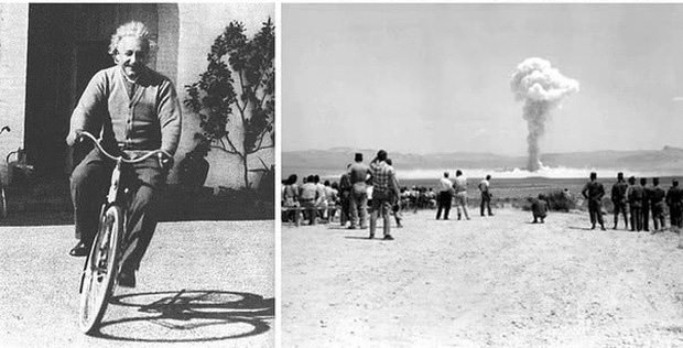 Bức ảnh của vụ nổ được chụp cách 7 năm, sau khi Albert Einstein qua đời. Trong khi bức ảnh Albert Einstein đạp xe được chụp trong sân nhà của ông.