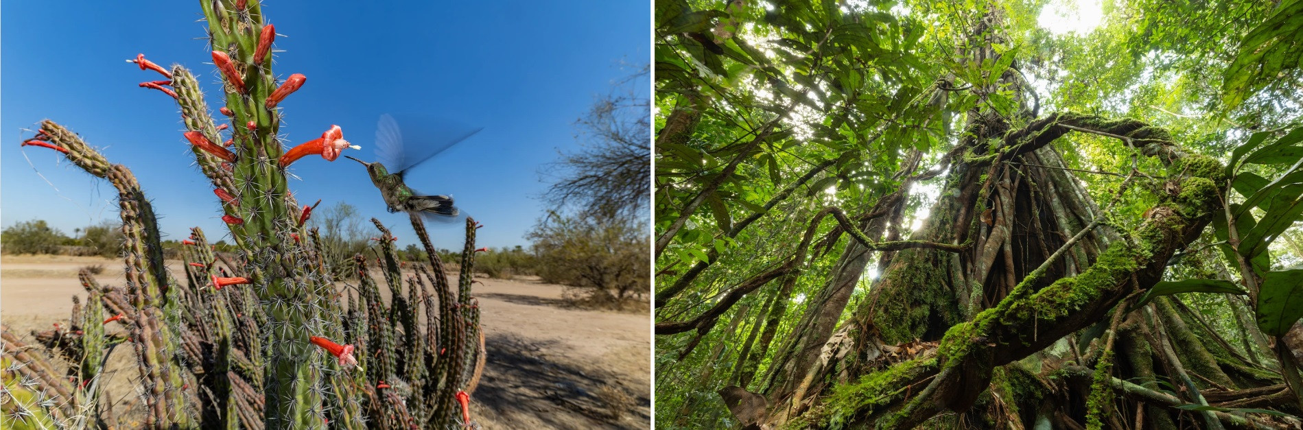 Một con chim ruồi đang hút mật từ một bông hoa xương rồng gần Hermosillo, Mexico. Trong thần thoại Aztec, loài chim nhỏ nhất thế giới tượng trưng cho thần mặt trời Huitzilopochtli.
