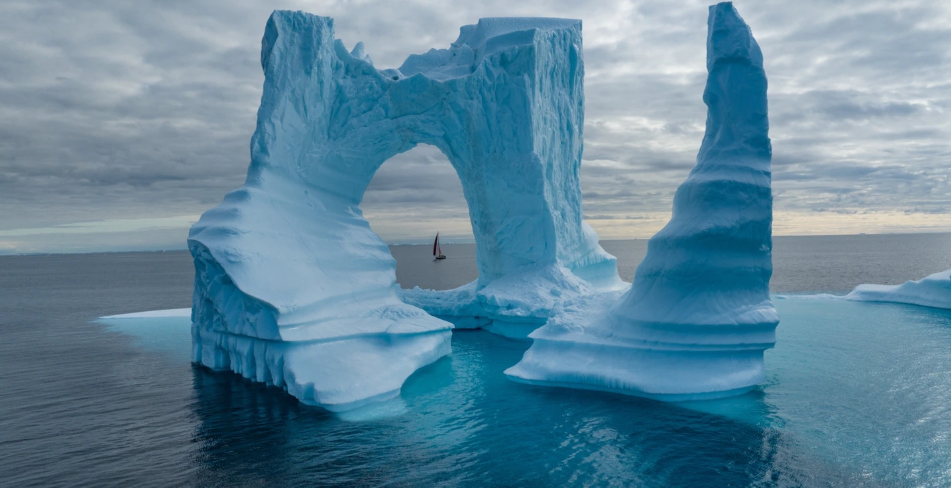 Một chiếc thuyền buồm điều hướng vùng nước băng giá quanh bờ biển Nova Scotian của Canada.