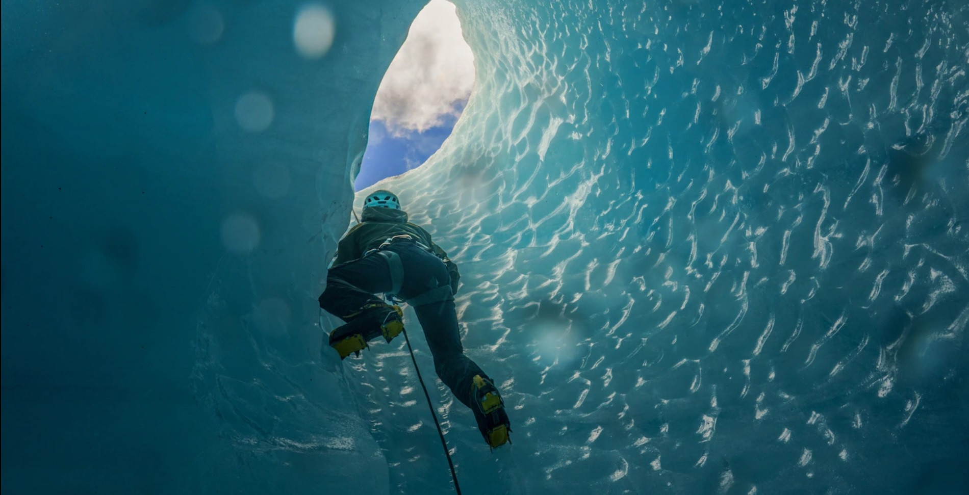 Một nhà thám hiểm đang cố gắng leo lên từ sông băng ở vùng Patagonia xa xôi, lộng gió của Chile.