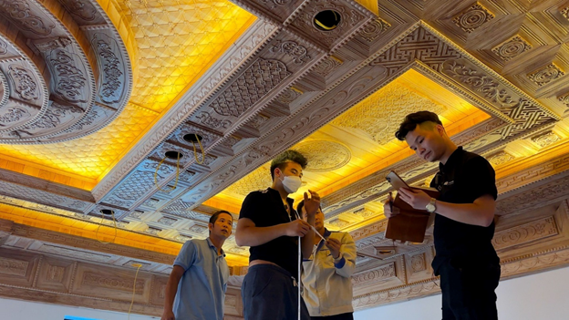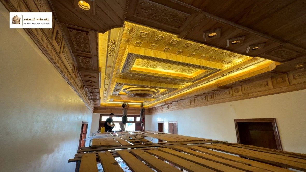 Kỹ thuật chạm khắc từ gỗ nguyên khối được thực hiện với sự tỉ mỉ và kỷ luật cao. Từng đường nét được chạm khắc cẩn thận, yêu cầu sự kiên nhẫn và tập trung tối đa. Sự sáng tạo không giới hạn cùng sự khéo léo đến chi tiết nhỏ nhất của đội ngũ thợ lành nghề Trần Gỗ miền Bắc đã tạo ra những “bức hoạ” trên trần nhà mang tính thẩm mỹ cao và độc đáo.