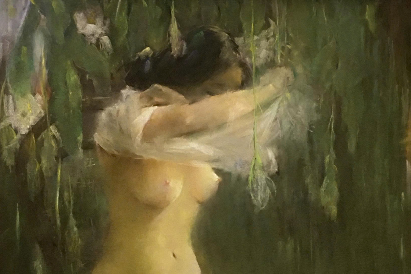 Lần này, họa sĩ giới thiệu thêm loạt tranh màu, sử dụng các tông xanh, cam… Phụ nữ trong tranh không có danh tính rõ ràng nhưng luôn đẹp trong khoảnh khắc họ chọn xuất hiện: thoắt ẩn hiện khi búi tóc, co gối, thân hình có dấu vết thời gian. Họ đã đến và họ đẹp, khiến không gian họ rời đi trở nên xao động.