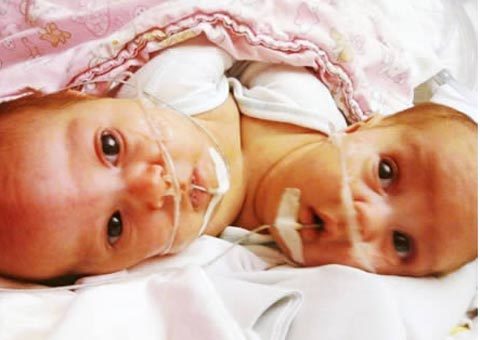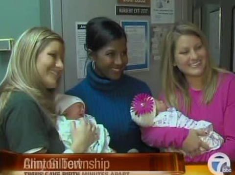 Hai chị em sinh đôi và cũng là bạn thân nhất của nhau có thể đưa việc sinh con vào danh sách những trải nghiệm họ cùng chia sẻ. Amy Gilbert và Allison Oliverio, đều 25 tuổi, chỉ cách nhau một bức tường tại bệnh viện Henry Ford Macomb khi cả hai cùng sinh nở lần đầu tiên và cho ra đời hai đứa trẻ chỉ cách nhau 14 phút. Không chỉ vậy, bé Claire - con của Amy và bé Garrett - con của Allison còn có tầm vóc nhỉnh khác nhau chút ít. Bác sĩ Timothy Kim đã đi đi lại lại giữa 2 căn phòng để đỡ đẻ cho cả hai chị em song sinh. Ông nói: "Tôi đã làm công việc đỡ đẻ cho các sản phụ được 12 năm và chưa từng nghe về việc cặp sinh đôi nào sinh con vào cùng ngày". Cả Amy và Allison đều cưới người yêu thời trung học của họ trước thời điểm sinh con 6 tháng. Hai chị em song sinh nói họ đã không lên kế hoạch mang bầu cùng lúc.