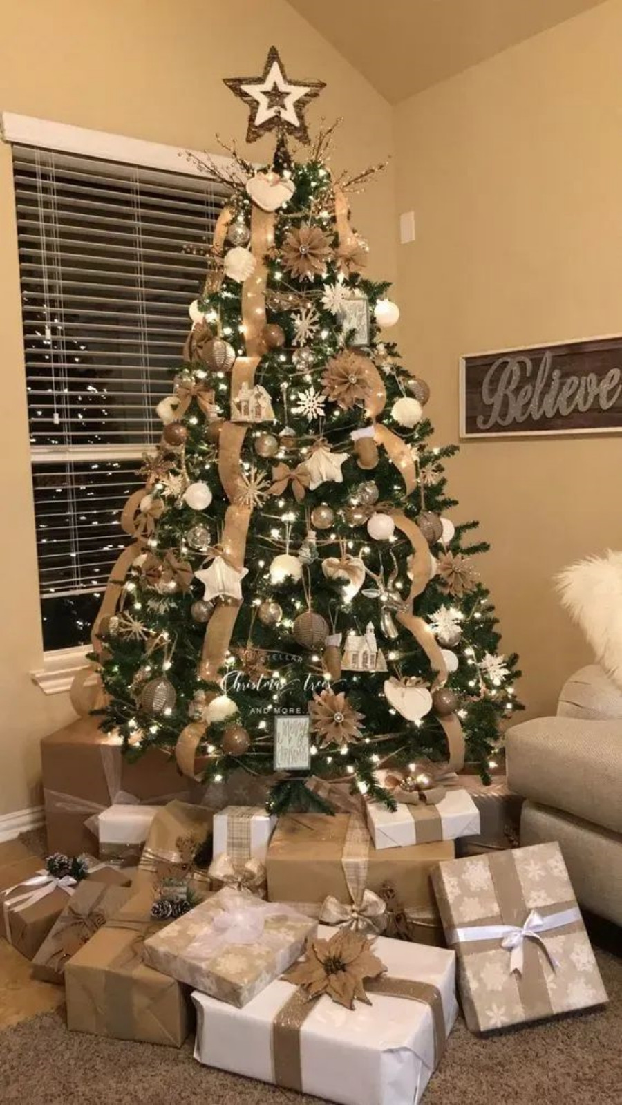 Dưới gốc cây, bạn có đặt vài hộp quà xinh xắn. Trên ngọn cây, bạn có thể trang trí thêm ngôi sao sáng lấp lánh. Ngoài ra, chúng ta có thể kết hợp thêm những phụ kiện khác như: vòng nguyệt quế, lọ hoa đỏ hoặc trắng,...