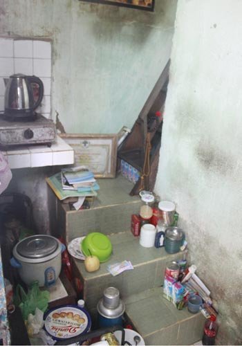 | Nhà nhỏ nên đồ đạc của cụ Thưởng cũng siêu nhỏ, từ ti vi, nồi cơm điện, bếp,… Trần nhà thì mục nát, tường nhiều chỗ bị đen mốc, có gác nhỏ nhưng chỉ dùng làm nơi để chứa đồ vì quá cũ, cầu thang cũng rất yếu. |
