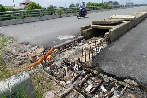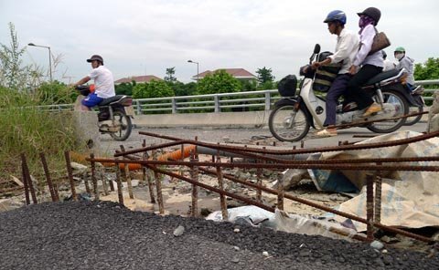 Ngày mưa cũng như ngày nắng, những hố voi tạo thành một ao nước. Mối nối giữa các nhịp cầu còn chơ sắt và có độ cao chênh lệch gần 20cm…