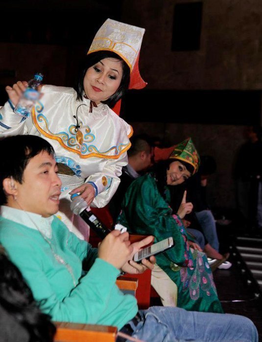 | Nghệ sĩ Tự Long (thứ 2 từ trái sang) tranh thủ ngủ trong khi chờ tổng duyệt. |