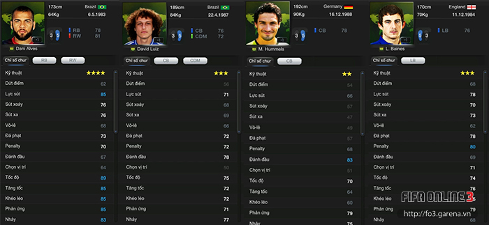 Dani Alves Thẻ WC; D. Luiz Thẻ WC; Hummels Thẻ WC; Leighton Baines WC: 3 trong số bộ tứ trung vệ này là những người thường xuyên có những tình huống thực hiện sút phạt rất nguy hiểm cho khung thành đối phương. Còn khi sút penalty, cả 4 được đánh giá rất cao với chỉ số lần lượt là 70, 72, 68 và 80.