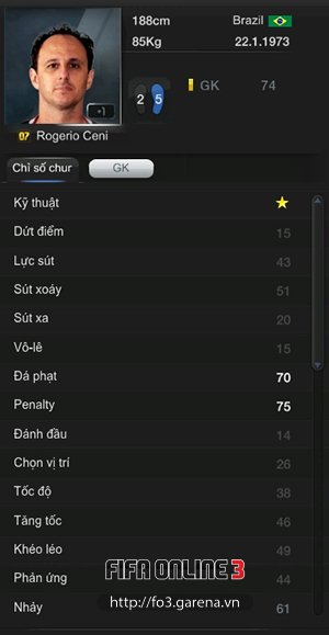 Rogério Ceni Thẻ ’07: Ceni dù mới giải nghệ nhưng trong FIFA Online vẫn còn thẻ cầu thủ này, sở hữu chỉ số sút phạt và sút penalty mà mọi thủ môn phải mơ ước. Đã không ít lần Ceni trở thành cứu tinh của đội khi thực hiện những siêu phẩm sút phạt với độ khó cao. Mùa 2007 là mùa Ceni thi đấu tốt nhất.