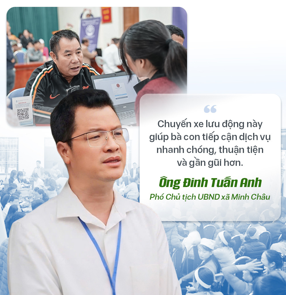 Ông Đinh Tuấn Anh, Phó Chủ tịch UBND xã Minh Châu cho biết, khoảng cách 20km từ xã lên huyện qua sông, qua phà gây khó khăn không nhỏ cho người dân. Do đó, chuyến xe lưu động này giúp bà con tiếp cận dịch vụ nhanh chóng, thuận tiện và gần gũi hơn.