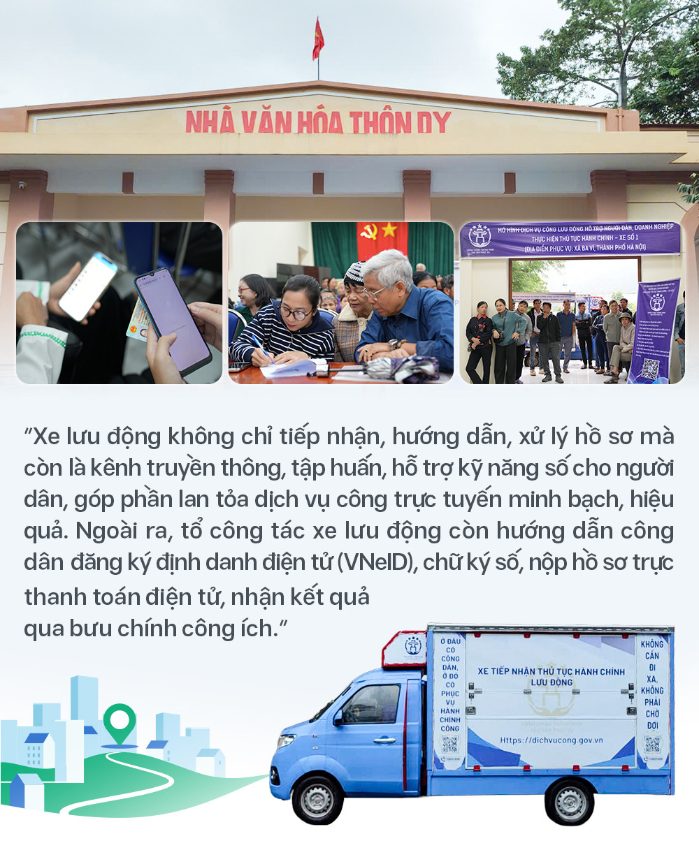 “Xe lưu động không chỉ tiếp nhận, hướng dẫn, xử lý hồ sơ mà còn là kênh truyền thông, tập huấn, hỗ trợ kỹ năng số cho người dân, góp phần lan tỏa dịch vụ công trực tuyến minh bạch, hiệu quả. Ngoài ra, tổ công tác xe lưu động còn hướng dẫn công dân đăng ký định danh điện tử (VNeID), chữ ký số, nộp hồ sơ trực tuyến, thanh toán điện tử, nhận kết quả qua bưu chính công ích”, cán bộ Phòng Tái cấu trúc và Tổ chức bộ phận một cửa Trung tâm Phục vụ Hành chính công TP Hà Nội thông tin.
