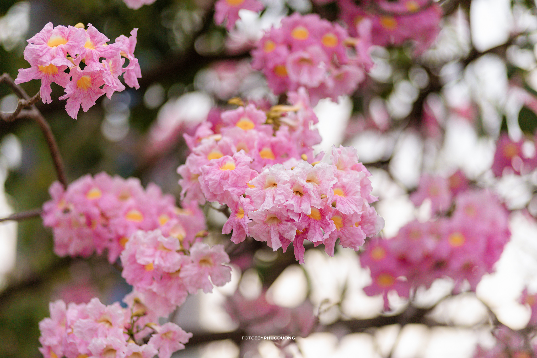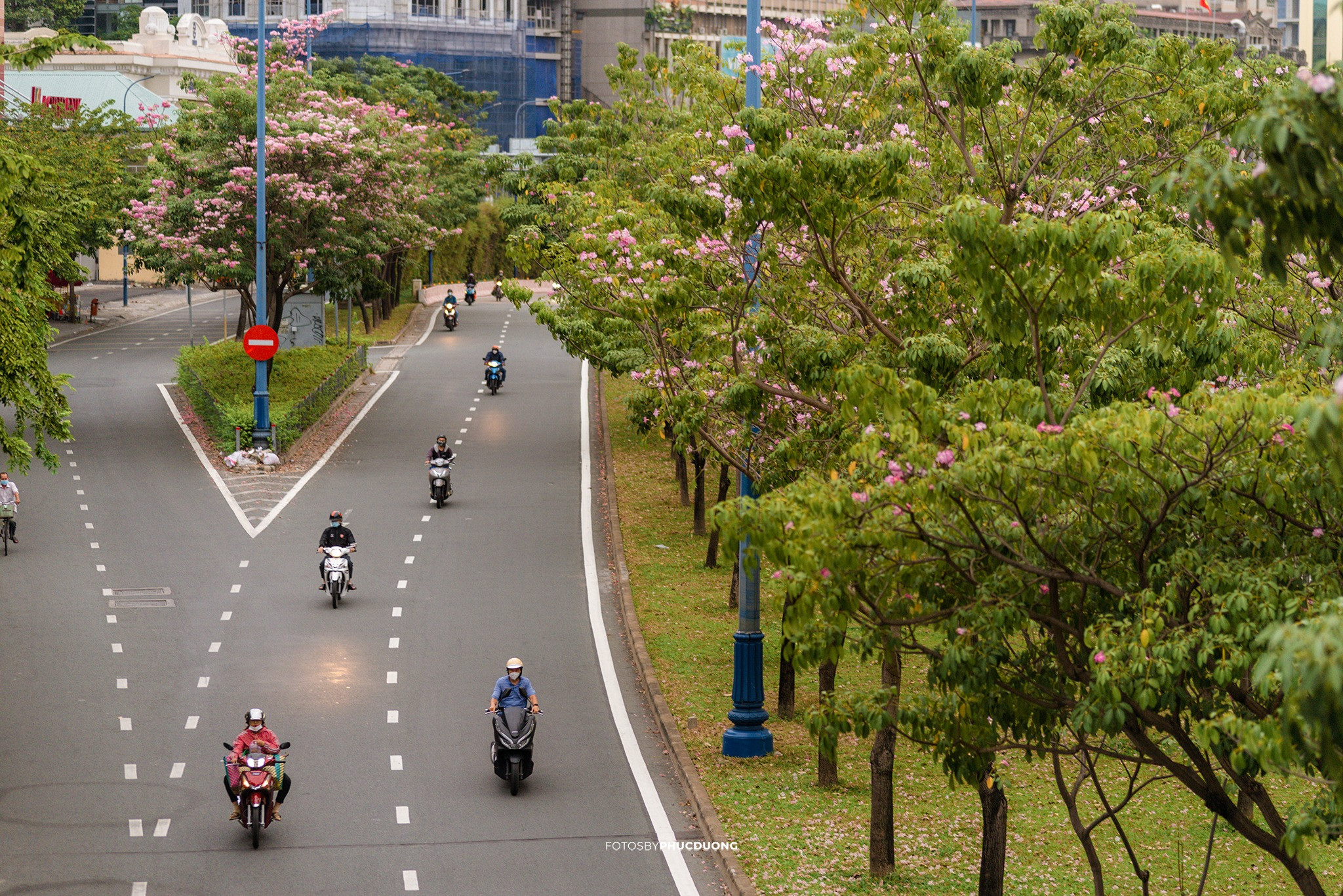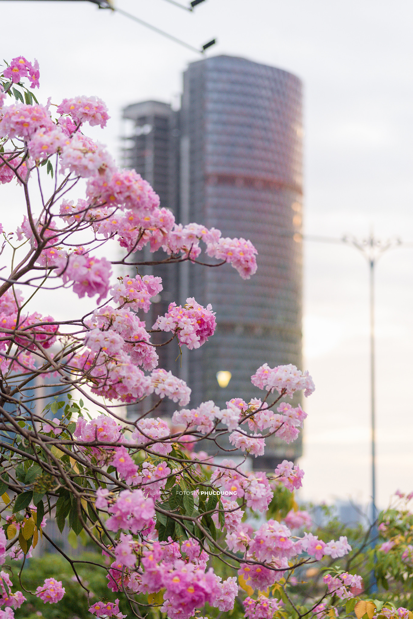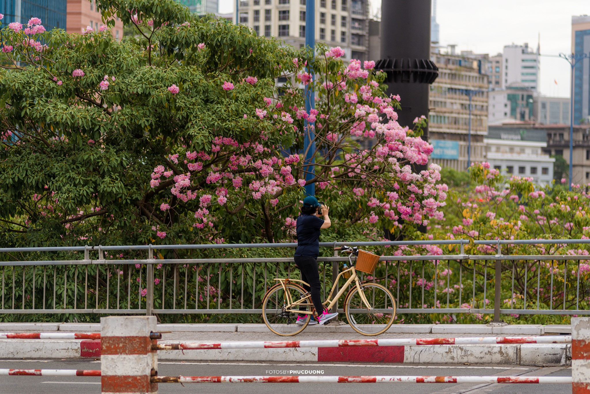 Khoảng 1 tuần trở lại đây, hoa kèn hồng bắt đầu khoe sắc trên một số con đường, góc phố tại TP.HCM như đường Điện Biên Phủ (Quận Bình Thạnh), khu vực cầu Calmette, đường hướng vào Hầm Thủ Thiêm (Quận 1), đường Hàm Nghi (Quận 1)...Thông thường, loài hoa này rộ sắc hồng vào khoảng cuối tháng 3 đến tháng 6 hàng năm. Năm nay, hoa nở sớm. Tại khu vực cầu Calmette, đường hướng vào Hầm Thủ Thiêm (Quận 1) hoa đã nở rộ. Những vạt hoa khoe sắc trong nắng làm khung cảnh Sài Gòn trở nên thơ mộng hơnKèn hồng có màu hồng dịu nhẹ, dạng giống hình chuông và mọc thành từng chùm khoảng 5 - 12 bông. Vì thế nó còn được gọi là hoa hồng chuông, hoa hồng phấn hay hồng loa kèn. Nếu nhìn xa, nhiều người nhầm tưởng kèn hồng là anh đào. Cây hoa thân gỗ, có nguồn gốc châu Mỹ ưa sáng, chịu nóng, phù hợp với đất khô nên thường được trồng nhiều ở đường đô thị. Kèn hồng được trồng ở trung tâm TP.HCM từ năm 2009Anh Dương Phúc - một lập trình viên đang sống và làm việc tại TP.HCM đã thực hiện bộ ảnh ghi lại khoảnh khắc mùa kèn hồng khoe sắc. Bộ ảnh được chụp vào 6-7h sáng tại khu vực cầu Calmette, khi lưu lượng phương tiện còn ít, người dân thong thả tập thể dục, dọn dẹp trước cửa nhà...Một người dân đang trên đường tập thể dục đã dừng xe, dùng điện thoại chụp lại cây kèn hồng nở bông rực rỡKhi hoa nở hầu hết các cành đều rụng lá trơ trụi. Hoa chỉ nở đẹp khoảng một tuần, vài ngày sau, gió mạnh là rụng dần. Tuy nhiên, đợt hoa này tàn thì đợt khác lại bung nở.