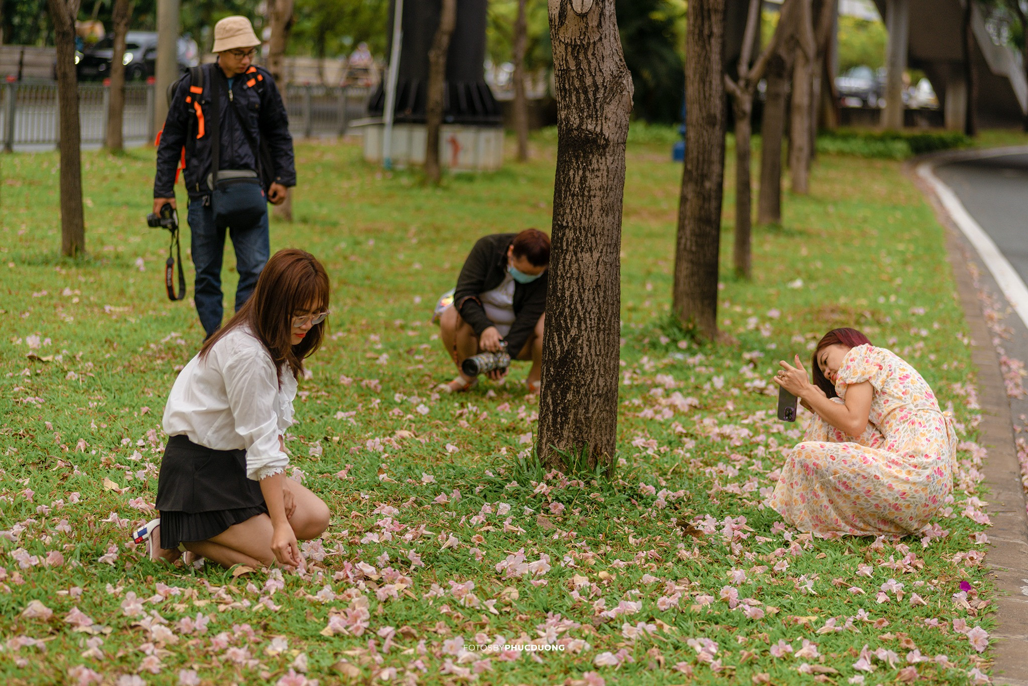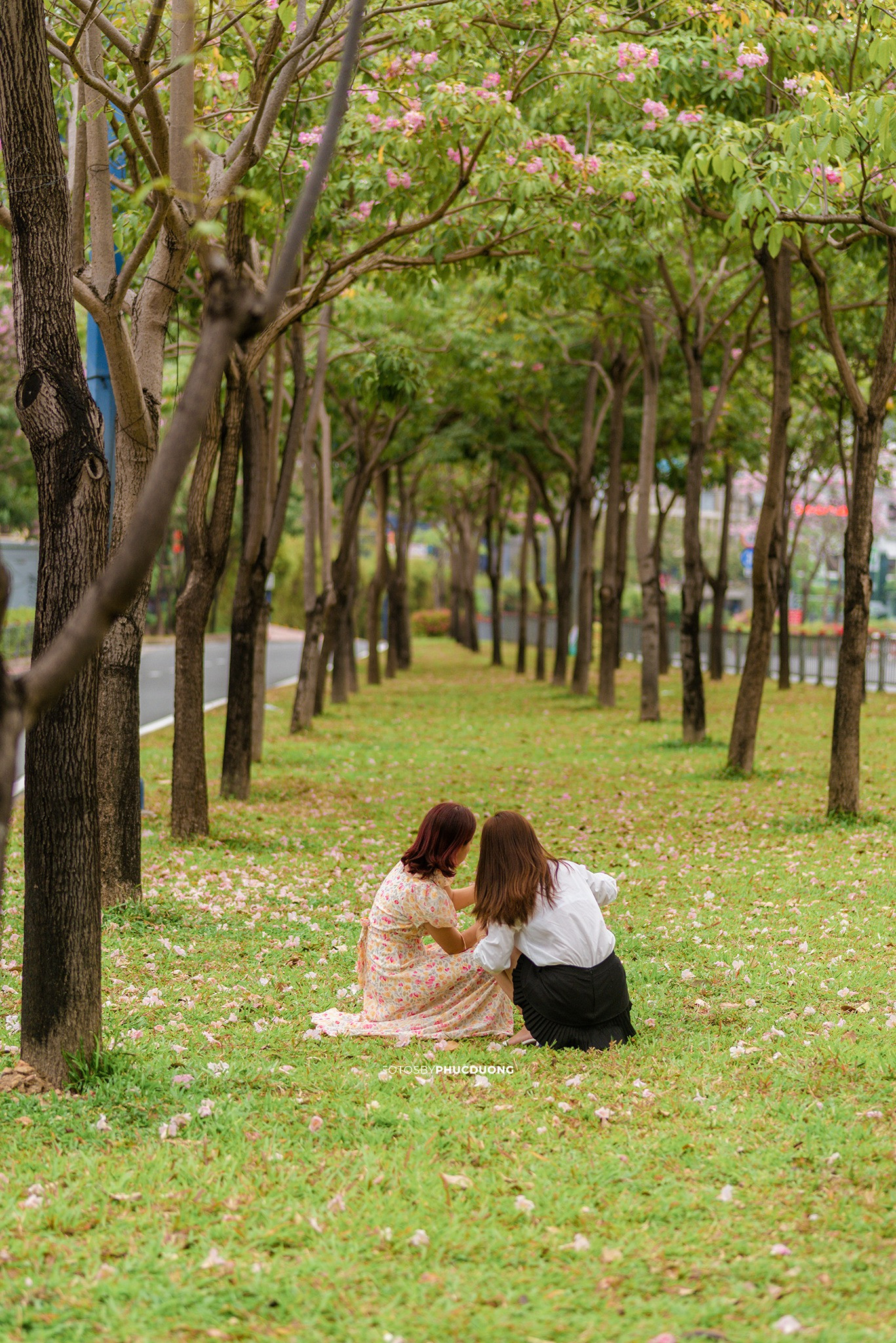 Bãi cỏ phía dưới cầu Calmette trồng nhiều cây kèn hồng và có không gian rộng nên nhiều người tìm tới chụp hình