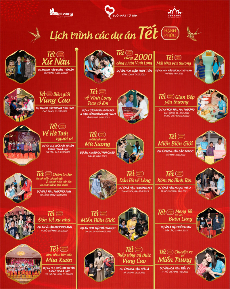 Dự án “Tết hạnh phúc - Cùng nhau làm nên mùa xuân” do CLB Suối mát từ tâm phối hợp với công ty CP Giải trí Sen Vàng thực hiện từ ngày 11/12/2022 -13/1/2023. Chương trình có sự tham gia của dàn hoa hoa hậu, á hậu thuộc quản lý của Cty Sen Vàng như Hoa hậu Hòa bình Quốc tế Nguyễn Thúc Thùy Tiên, Hoa hậu Liên lục địa Lê Nguyễn Bảo Ngọc, Hoa hậu Lương Thùy Linh, Hoa hậu Huỳnh Nguyễn Mai Phương, Hoa hậu Đoàn Thiên Ân, Hoa hậu Huỳnh Thị Thanh Thủy, Á hậu Nguyễn Hà Kiều Loan, Á hậu Nguyễn Tường San, Á hậu Phạm Ngọc Phương Anh, Á hậu Nguyễn Phương Nhi, Á hậu Trịnh Thùy Linh, Á hậu Lê Nguyễn Ngọc Hằng, Người đẹp Áo dài - Top 10 Hoa hậu Việt Nam 2022 Trần Thị Bé Quyên và diễn viên nhí Bảo Ngọc cùng “Bà trùm Hoa hậu” Phạm Kim Dung - Chủ tịch CLB Suối mát từ tâm, đồng thời là CEO công ty CP Giải trí Sen Vàng và Đạo diễn Hoàng Nhật Nam.