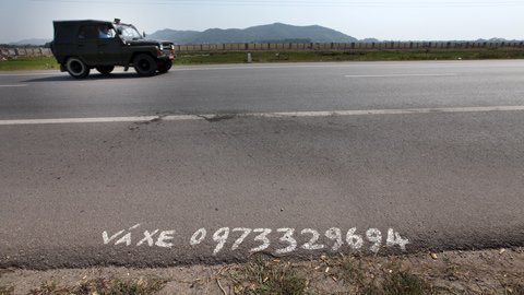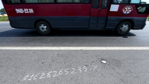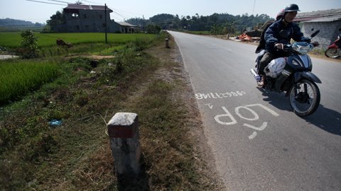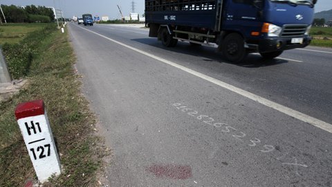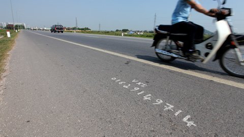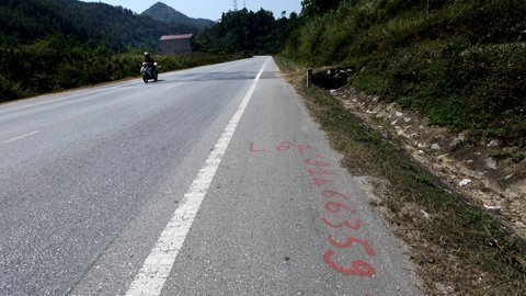 Quảng cáo được vẽ nguệch ngoạc bằng sơn đỏ trên mặt đường 1A đoạn