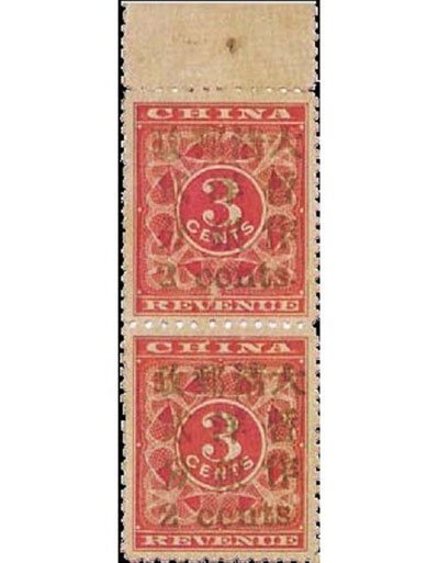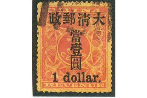 Con tem này cũng là một con tem thuế được dùng làm tem bưu chính trong thời nhà Thanh (1644-1911) ở Trung Quốc. Trong giai đoạn cải cách tiền tệ của nhà Thanh, những con tem có mệnh giá tính bằng bạc không được sử dụng nữa. Trong thời gian chuyển giao, người ta dùng mực xanh để in lên con tem thuế có màu đỏ này để dùng như con tem bưu chính tạm thời. Hiện chỉ còn lại khoảng 9 con tem loại này. Vào năm 2004, một con tem này được bán đấu giá ở mức 3,45 triệu Đôla Hồng Kông, tương đương 444.447 USD, tại Hồng Kông.