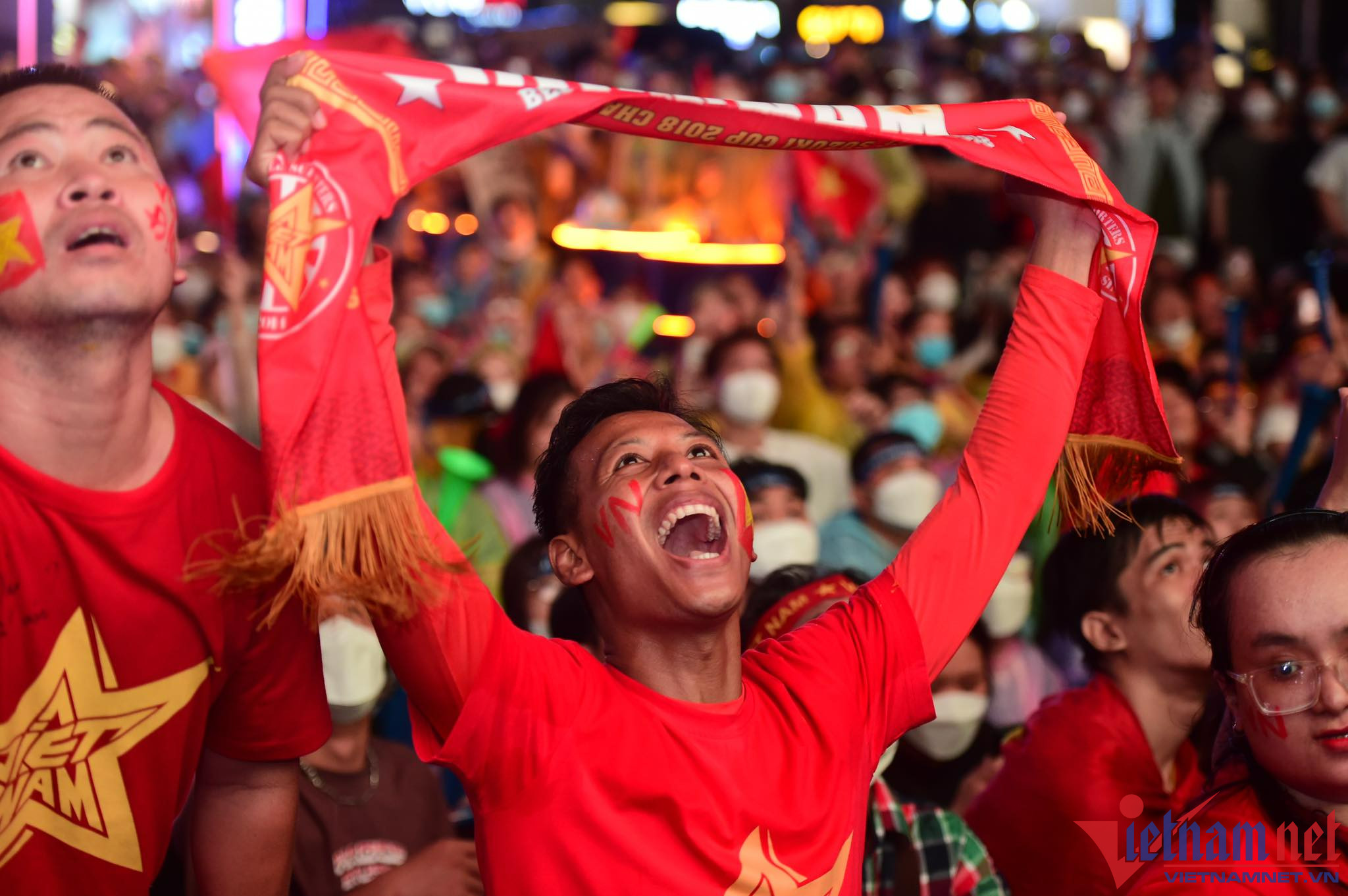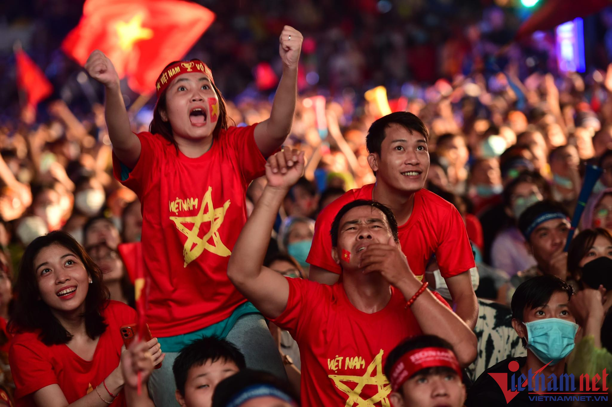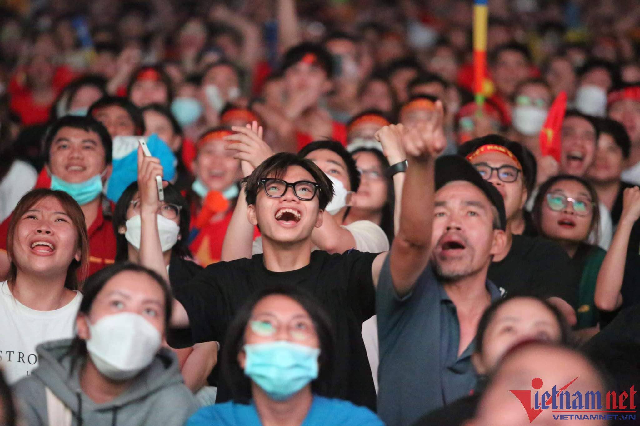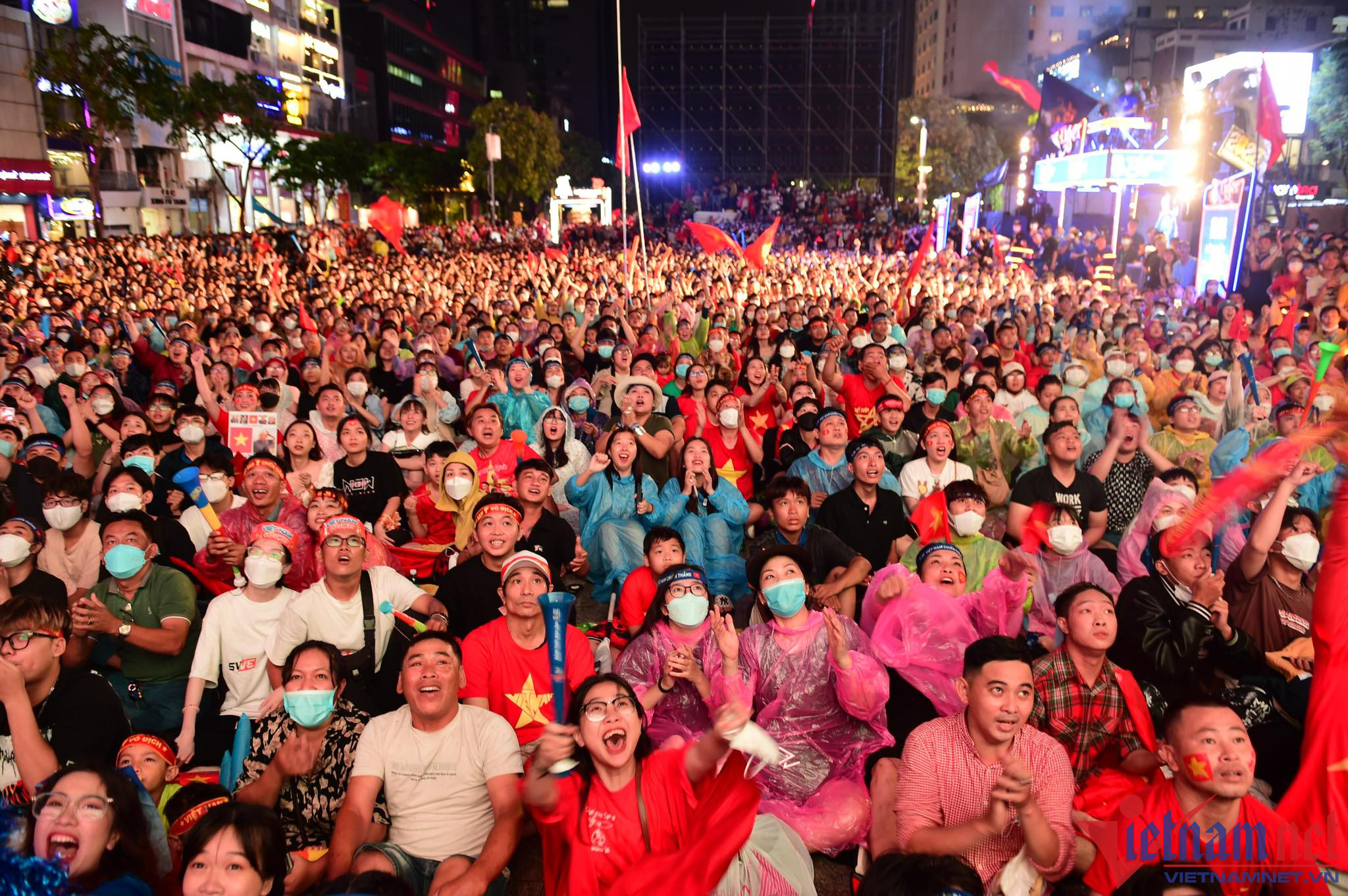 Hàng nghìn cổ động viên tập trung trước màn hình lớn trên phố đi bộ Nguyễn Huệ (TP.HCM) cổ vũ cho đội tuyển U23 Việt Nam trong trận chung kết bóng đá nam SEA Games 31. Nhiều cung bậc cảm xúc được ghi nhận.