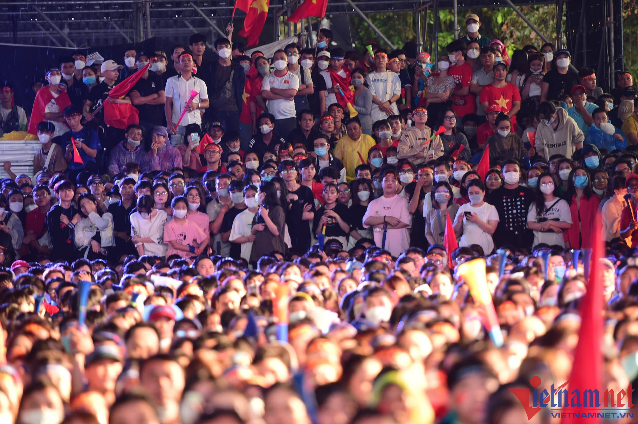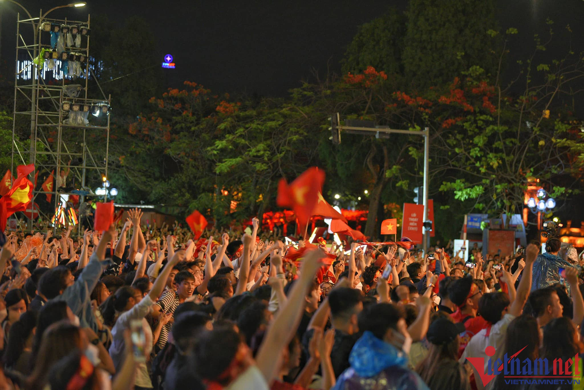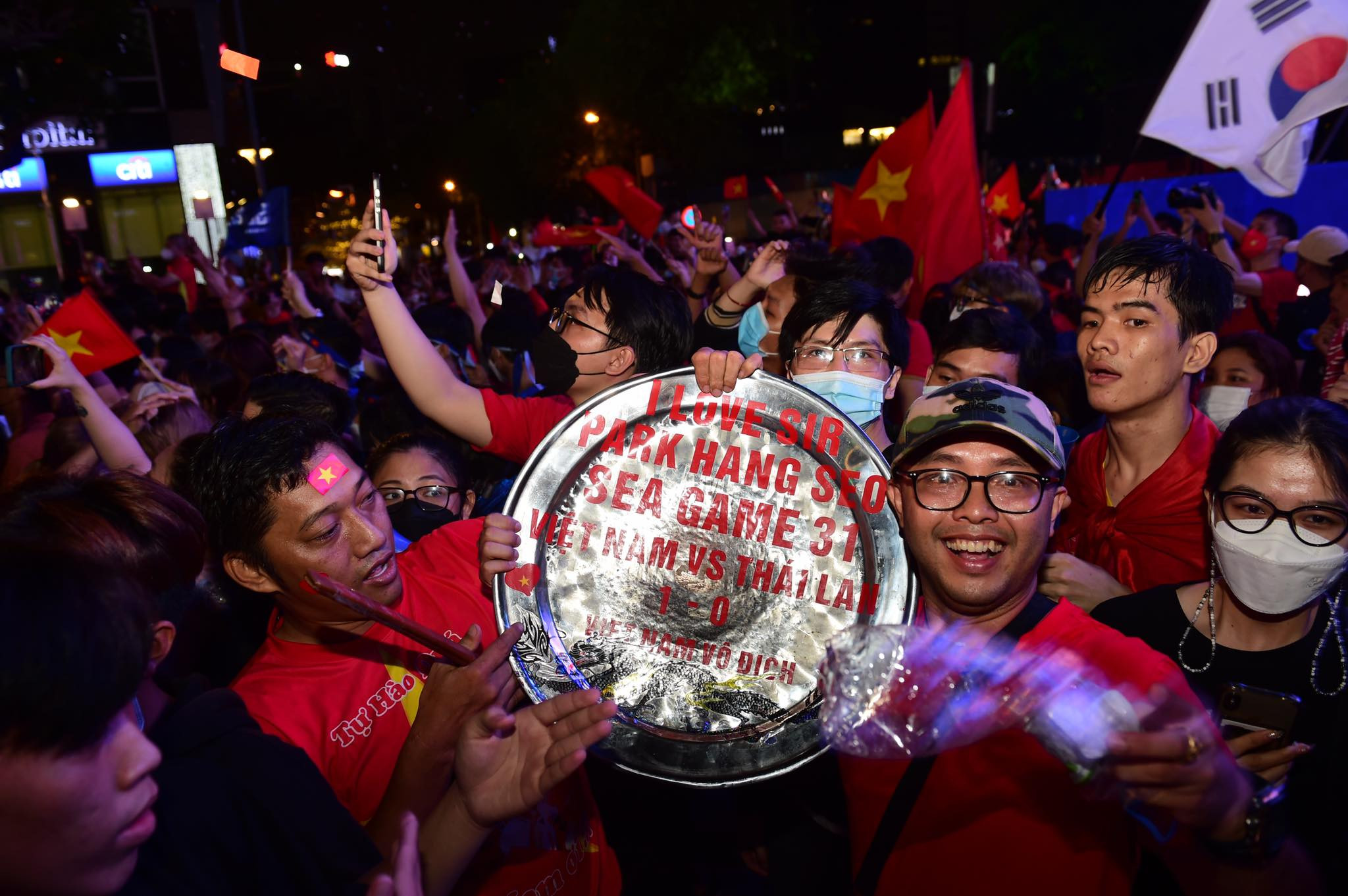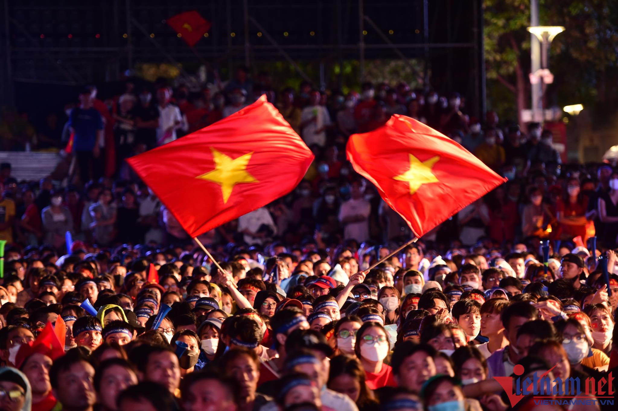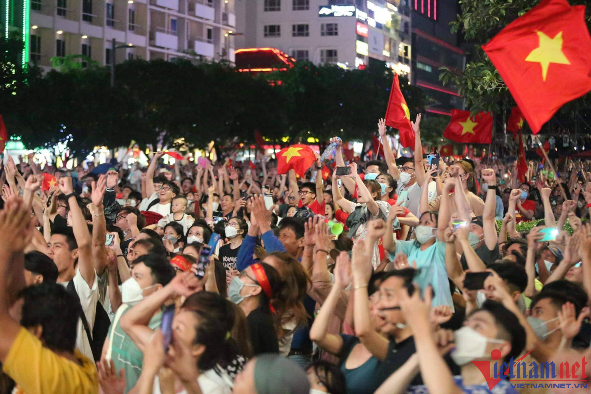 Hàng nghìn cổ động viên tập trung trước màn hình lớn trên phố đi bộ Nguyễn Huệ (TP.HCM) cổ vũ cho đội tuyển U23 Việt Nam trong trận chung kết bóng đá nam SEA Games 31. Nhiều cung bậc cảm xúc được ghi nhận.