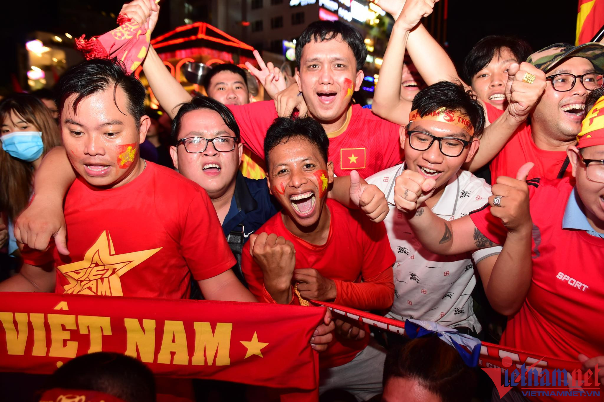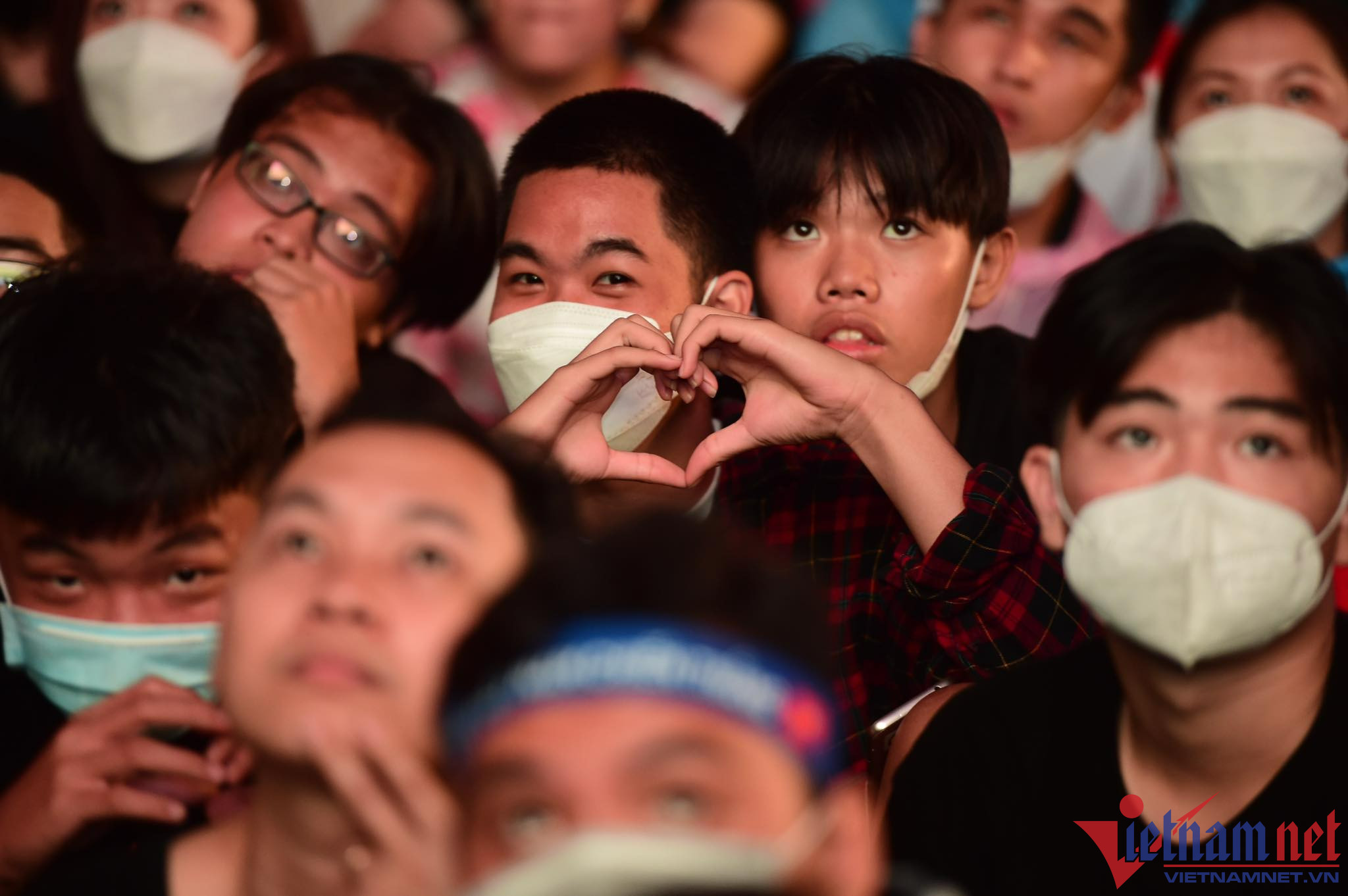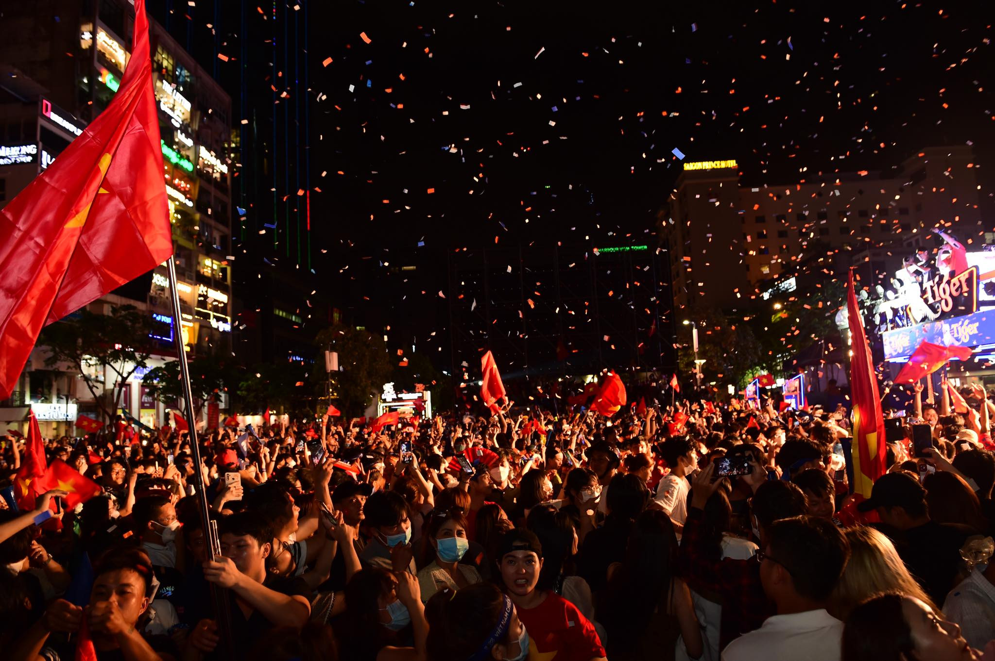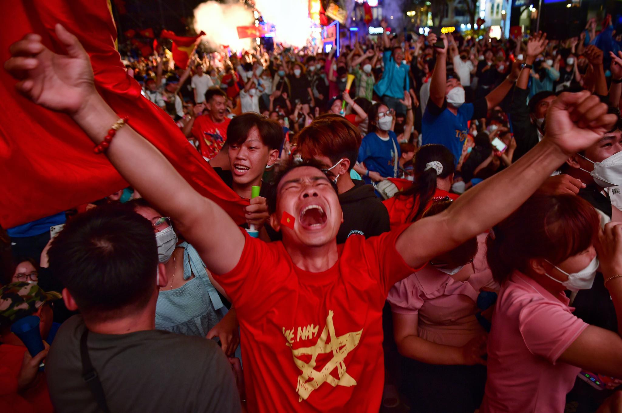 Hàng nghìn cổ động viên tập trung trước màn hình lớn trên phố đi bộ Nguyễn Huệ (TP.HCM) cổ vũ cho đội tuyển U23 Việt Nam trong trận chung kết bóng đá nam SEA Games 31. Nhiều cung bậc cảm xúc được ghi nhận.
