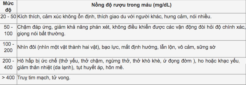 Theo TS Nguyễn Trung Nguyên, Giám đốc Trung tâm Chống độc, Bệnh viện Bạch Mai (Hà Nội), ở người ít uống rượu (ethanol), các biểu hiện ngộ độc rượu cấp tính từ nhẹ đến nặng thường đi cùng với nồng độ rượu trong máu như sau: