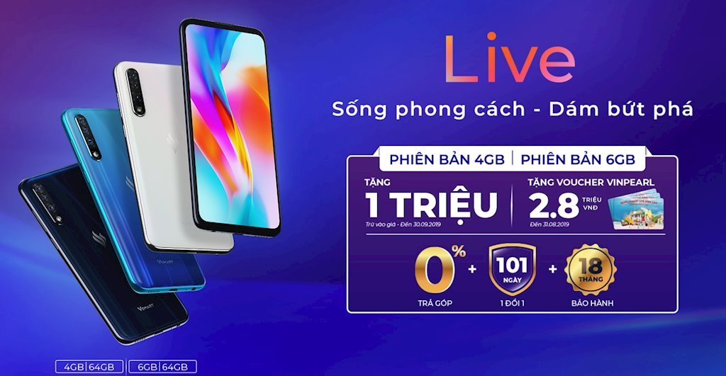 Vsmart Live được trang bị 3 màu bắt trend là xanh cực quang, trắng ngọc trai và đen huyền bí trên mặt lưng gradient với hiệu ứng các vân quang học ấn tượng. Một ưu điểm lớn của của chiếc Vsmart Live là cảm biến vân tay được đặt trong màn hình. Đây là điểm ưu điẻm vượt trội cho 1 điện thoại thông minh thương hiệu Việt, giúp tăng diện tích viên pin của Vsmart Live, tạo ra một vẻ ngoài trơn tru hoàn hảo.
