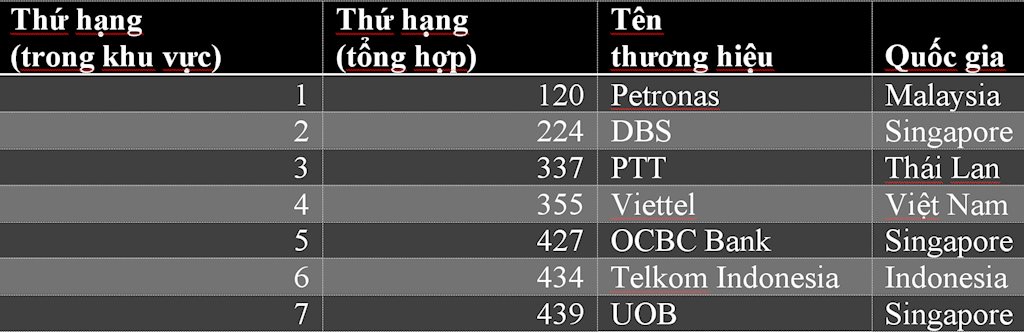 Tính tất cả các ngành nghề thì Đông Nam Á có 7 công ty lọt vào top 500 công ty có giá trị thương hiệu lớn nhất thế giới, trong đó Viettel được xếp thứ 4, vượt qua OCBC Bank (Singapore), Telekom Indonesia (Indonesia), UOB Bank (Singapore). Trên bảng xếp hạng của Brand Finance Global 500, nếu tính ở khu vực, Viettel đứng sau PTT (dầu khí Thái Lan), DBS (Singapore) và Petronas (Malaysia).