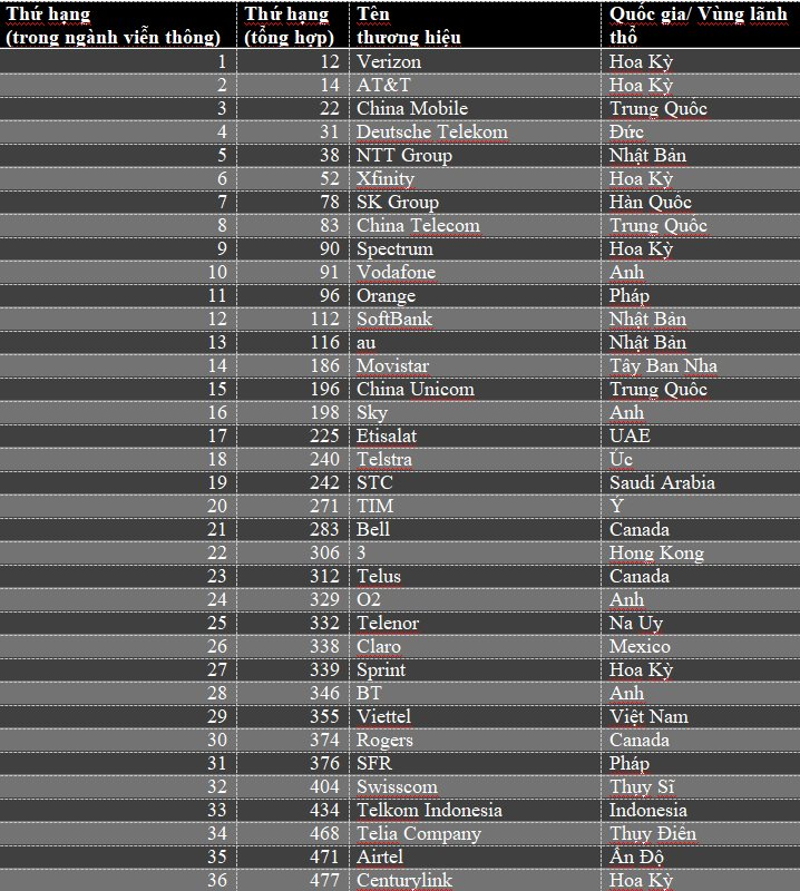 Trong số ít các nhà khai thác viễn thông đã tăng giá trị thương hiệu trong năm nay, vị trí hàng đầu thuộc về Viettel, ghi nhận mức tăng trưởng ấn tượng 34% lên 5,8 tỷ USD và tăng 126 bậc lên mức 355. Đây cũng là mức tăng hạng cao nhất trong bảng xếp hạng Global 500 năm nay của Brand Finance.