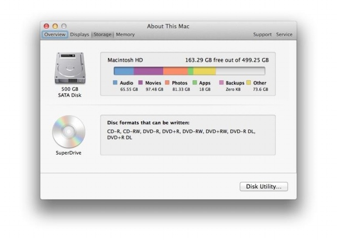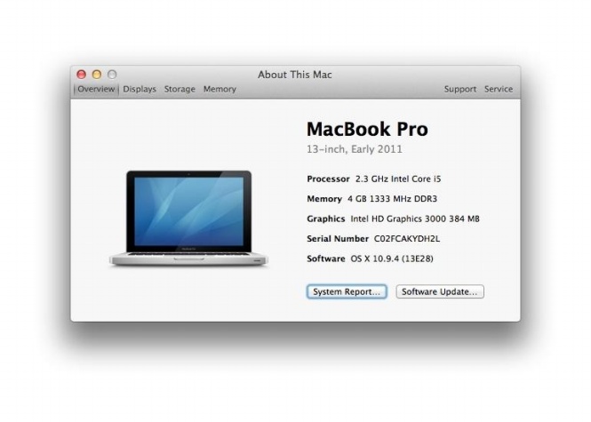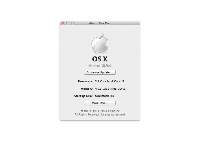 Yosemite yêu cầu máy Mac phải có tối thiểu 2 GB RAM và 8 GB bộ nhớ lưu trữ. Bạn có thể xem thông tin về RAM ở cửa sổ “About This Mac” phía trên, còn thông tin bộ nhớ lưu trữ có thể xem ở mục “More Info” (click vào mục Storage).