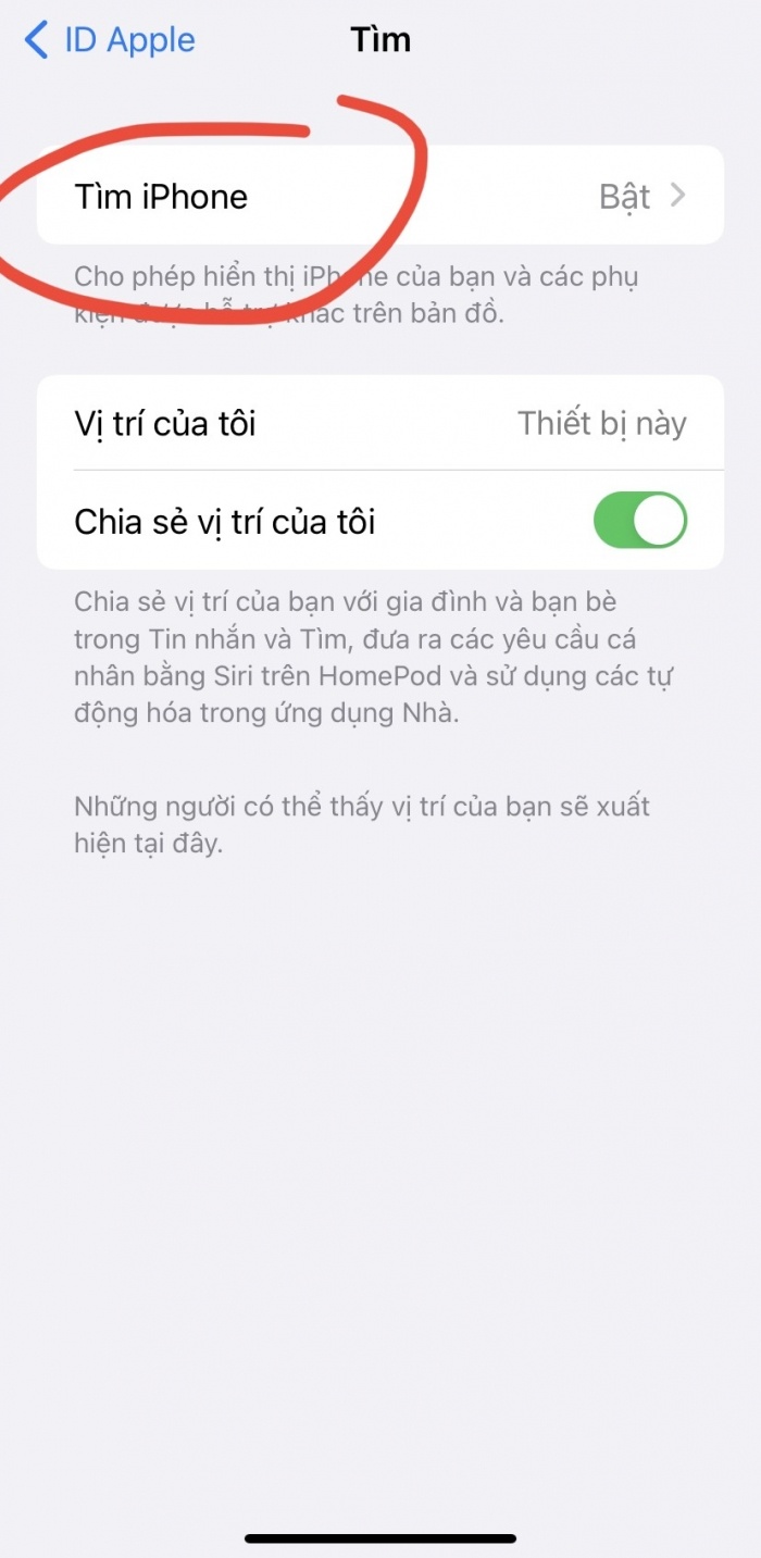 Nhấn vào nút chuyển đổi Tìm iPhone của tôi để tắt nó.