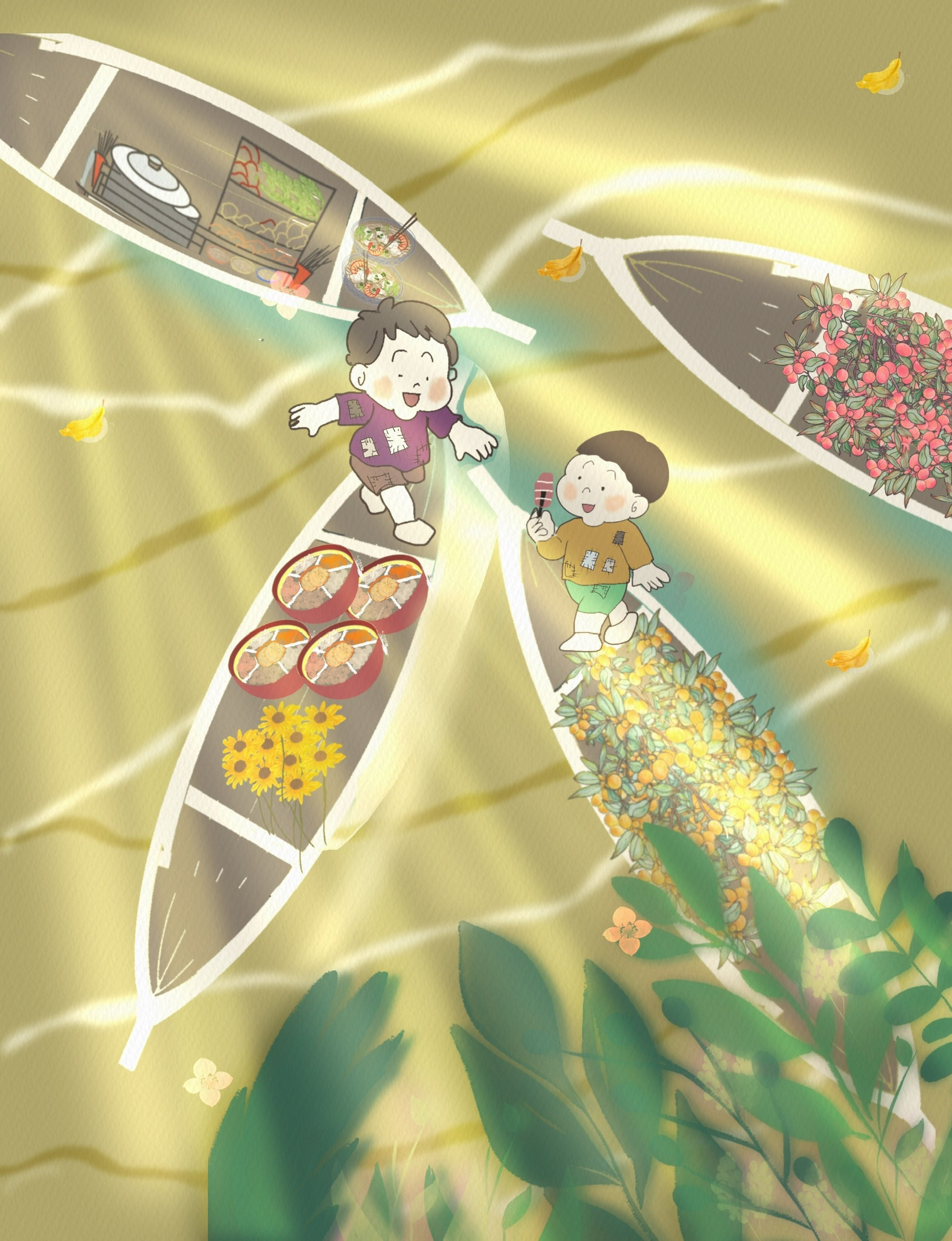 Đó là những mùa gặt vui nhất vì tôi được má cho xuống ghe nhà Thái chơi, bình thường má không cho tôi đi xuống sông một mình. Năm dài tháng rộng, tôi cứ chờ đến mùa lúa chín, tôi để dành sách đọc cho Thái nghe. Thái không biết chữ, ghe đậu chỗ này một vài con trăng lại nhổ sào xuôi về hướng khác nên Thái không được học hành gì. Có hôm tôi theo gia đình Thái đi bán muối, ghe băng băng qua những dòng nước và dừng lại ở một đoạn ghe xuồng tấp nập neo sào họp chợ. Khoảng sông đó gọi là ngã năm, ngã bảy, người người đến bán mua, rộn rịp cả vùng. Thái móc túi ra được vài tờ tiền nhàu nhĩ đãi tôi ăn đá bào. Mặt mày đứa nào cũng ngời ngời trong nắng, niềm vui tròn trịa tuổi thơ chảy ròng ròng những giọt mồ hôi. Vì vui quá nên năm nào cũng vậy, tôi bịn rịn, mặt thằng Thái cũng buồn so khi ghe rời bến. Lời hẹn mùa lúa tới nghe sao nó xa mút chỉ cà tha.