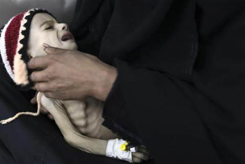 Đứa trẻ gầy giơ xương tại bệnh viện al-Sabyeen.