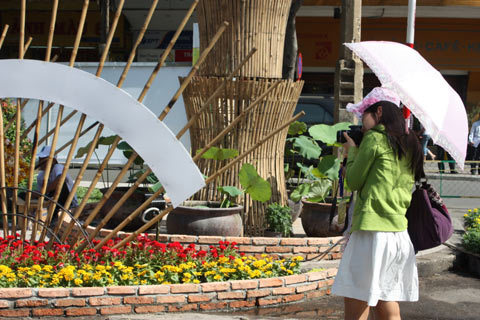 Những du khách đầu tiên có mặt và tỏ ra thích thú với khung cảnh đường hoa.