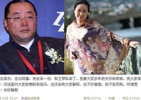 Vào tối 16/5, người sáng lập tập đoàn công nghiệp kỹ thuật và khoa học Zhongfu, Giang Tô này “mạnh miệng” thông báo trên Sina Weibo - một trang blog đình đám không kém Twitter: "Gửi bạn bè, người thân và các đồng nghiệp, tôi sẽ từ bỏ tất cả và ra đi với Wang Qin. Cảm ơn các bạn về sự quan tâm lẫn ủng hộ trong những năm qua. Tôi chúc mọi người hạnh phúc. Tôi không thể đáp lại sự mong mỏi và lòng tin tưởng của mọi người. Tôi xin lỗi vì ra đi không nói lời từ biệt. Xin mọi người tha thứ".