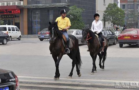| Đại gia He thong dong trên ngựa tới công sở. |