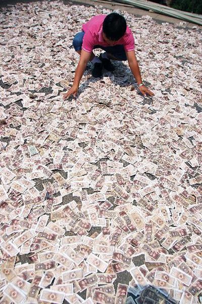 Tiền nhiều như lá đa, chất lâu trong nhà sợ ẩm mốc, một người đàn ông tên Yang, tại Quý Châu, Trung Quốc lâu lâu lại mang số tài sản rải trắng mặt sân hong nắng. Được biết, đây là bộ sưu tập tiền cổ với mệnh giá một hào được ông Yang “nâng như nâng trứng” suốt nhiều năm qua. Tổng giá trị thực của các đồng tiền khoảng 2.000 NDT (tương đương 6,7 triệu đồng), nhưng vì là đồ cổ nên đắt giá hơn gấp bội phần.