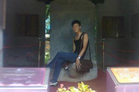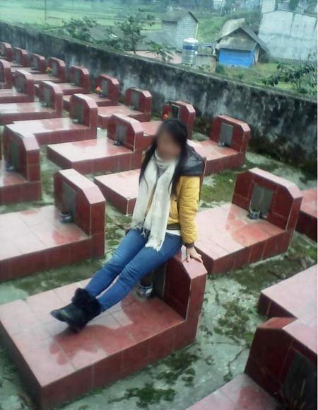 Trước đó, vào tháng 1/2013 bức ảnh ghi lại cảnh một nữ sinh ngồi chụp hình một cách thoải mái ở một khu nghĩa trang liệt sĩ khiến dân mạng không khỏi sửng sốt. Cô bạn có gương mặt dễ thương với nhưng hành động lại thiếu văn hóa khi chân mang giày ngồi lên bia mộ liệt sĩ để khoe dáng.