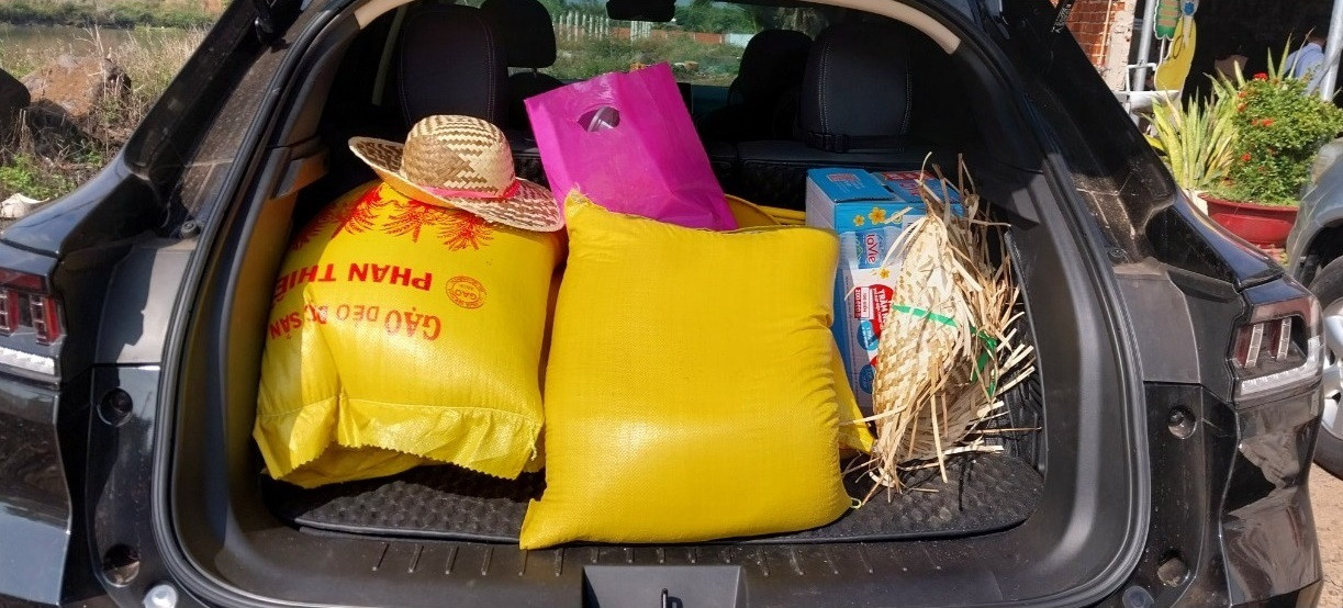 “Tết Quý Mão 2023, mình cùng vợ chất mấy bao gạo ngon vào cốp VF 8. Hàng xóm trông thấy hỏi đi chơi sao lại chở theo gạo, mình hài hước đáp rằng để nấu cơm dọc đường. Thực ra, hai vợ chồng dự định trên đường sẽ chia gạo cho bà con nghèo”, anh Trung kể.