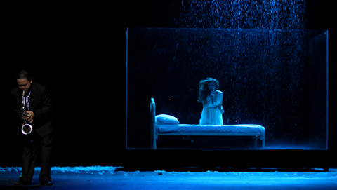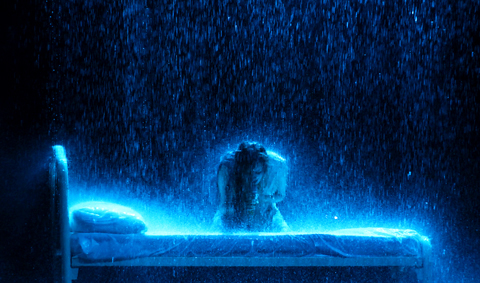 Những cơ mưa thật trên sân khấu trong bài hát "Căn phòng mưa rơi".