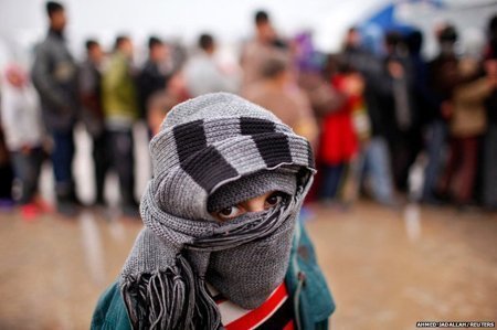 Một cậu bé đi qua dòng người Syria tị nạn đang đứng đợi để nhận được viện trợ từ các tổ chức nhân đạo Thổ Nhĩ Kỳ tại trại tị nạn Bab al-Salam, Syria, gần biên giới Thổ Nhĩ Kỳ. (Ảnh: Reuters)