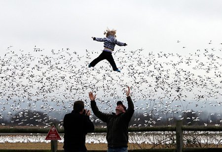 Một ông bố ở La Conner (Mỹ) tung con gái lên không trung khi những con ngỗng tuyết đang bay tới thung lũng Skagit. (Ảnh: AP)