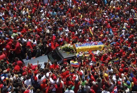 Quan tài của Tổng thống Venezuela Hugo Chavez giữa biển người tiếc thương tại thủ đô Caracas sau khi rời khỏi bệnh viện quân sự, nơi ông trút hơi thở cuối cùng.