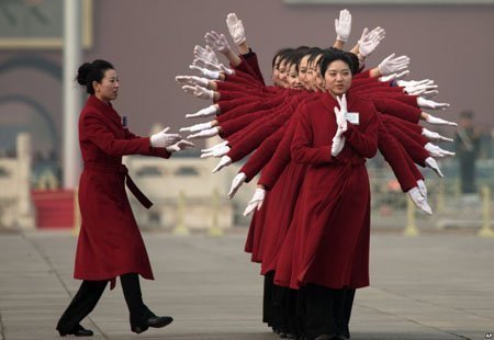 Các nhân viên lễ tân tại Đại hội đại biểu Nhân dân toàn quốc (Trung Quốc) chụp hình lưu niệm trên Quảng trường Thiên An Môn tại Đại lễ đường Nhân dân ở thủ đô Bắc Kinh.