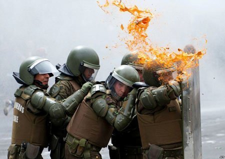 Cảnh sát chống bạo động Chile dùng tấm chắn để tự vệ trong vụ đụng độ với sinh viên, những người yêu cầu chính phủ của Tổng thống Sebastián Piñera phải cải thiện hệ thống giáo dục công, tại Santiago.